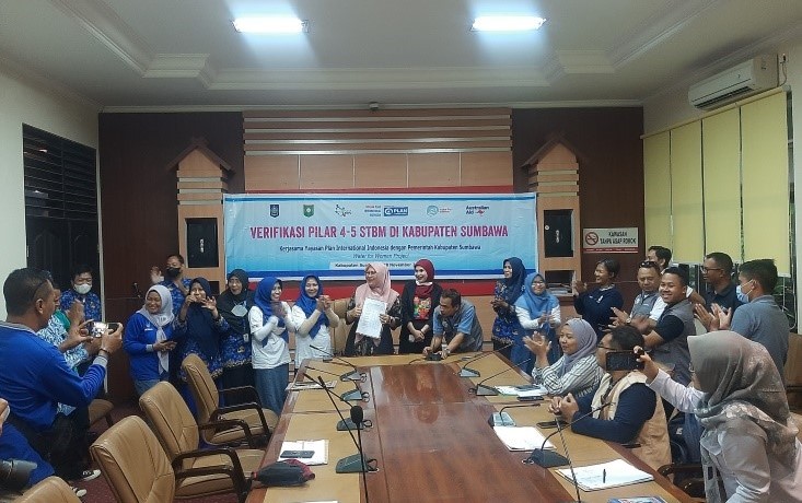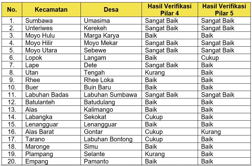Berdasarkan hasil verifikasi pilar 4 dan 5 STBM di tabel atas, Kabupaten Sumbawa dinyatakan telah “lulus” sebagai Kabupaten STBM ke empat di Provinsi NTB, setelah Kabupaten Sumbawa Barat, Kota Mataram dan Kabupaten Lombok Barat. Prosesi serah terima hasil verifikasi Pilar 4 dan 5 Program STBM diterima oleh Wakil Bupati Sumbawa bersama Perwakilan OPD serta Yayasan PLAN International Indonesia di Aula Hasan Usman-Lantai 1 Kantor Bupati Sumbawa. Terhadap desa/kelurahan yang mendapat predikat “cukup” dan “kurang” akan dilakukan intervensi oleh Pemerintah Kabupaten dan Pemerintah Kecamatan agar status Kabupaten STBM tetap terjaga.