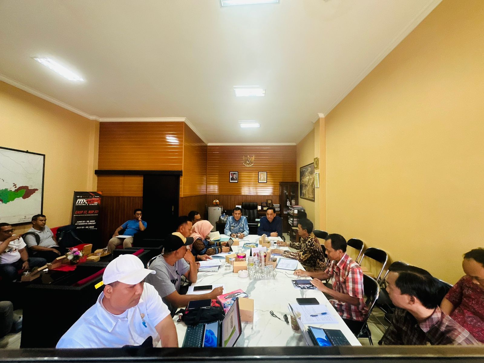 Rakor tersebut dipimpin langsung oleh Bupati Sumbawa, Dr. Ir. H. Syafruddin Jarot, M.P., didampingi Sekretaris Daerah Kabupaten Sumbawa, Dr. H. Budi Prasetyo, S.Sos., M.Ap., serta Kepala Bappeda, Dr. Dedy Heriwibowo, S.Si., M.Si. Turut hadir para pimpinan Organisasi Perangkat Daerah (OPD) yang berada di bawah koordinasi bidang infrastruktur dan kewilayahan, antara lain DPUPR, DPRKP, DLH, DKISS, Dinas Perhubungan, Satpol PP, Damkar, dan BPBD.