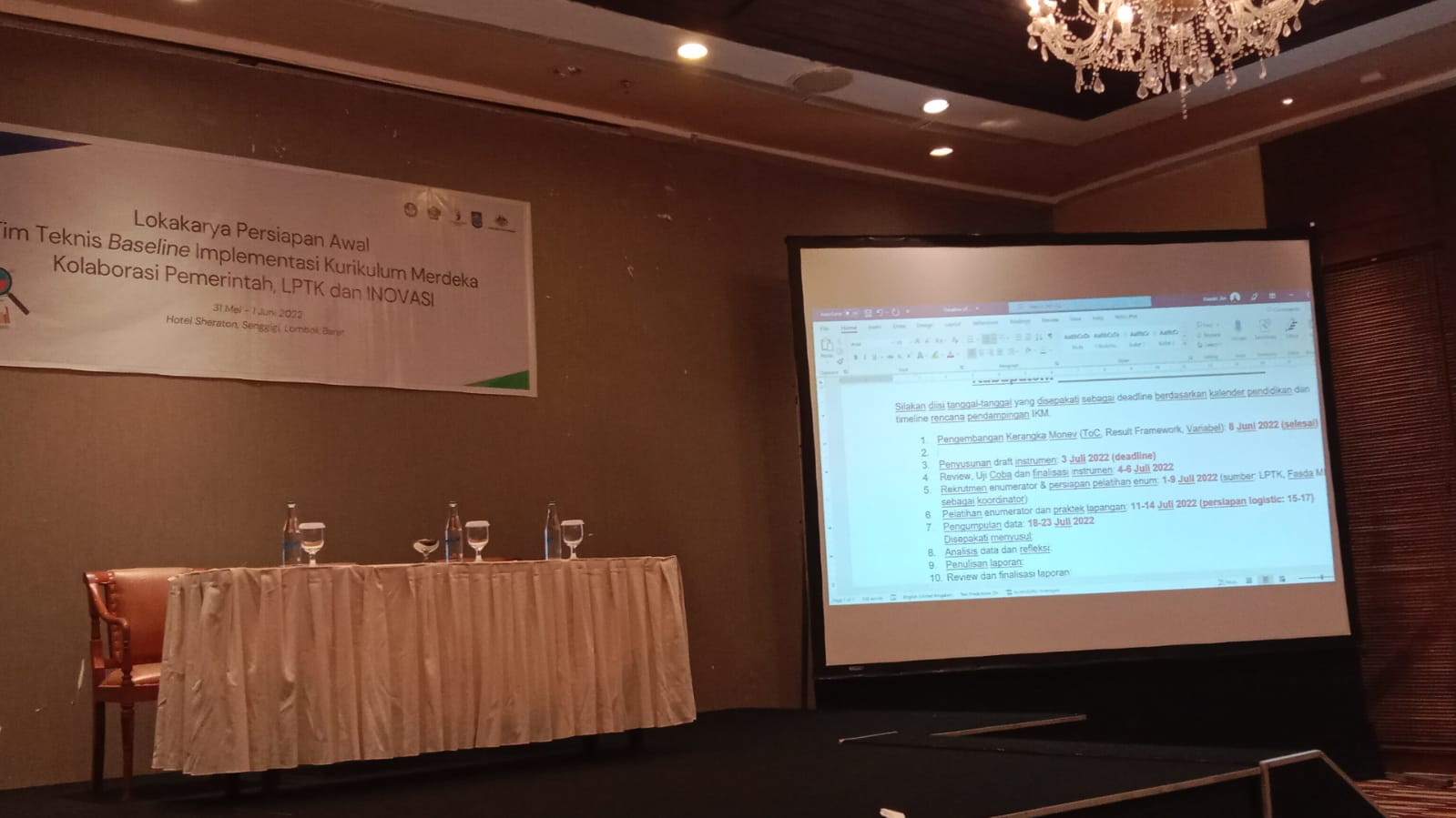 Lokakarya persiapan awal tim teknis baseline implementasi kurikulum merdeka kolaborasi pemerintah, LPTK dan INOVASI dilangsungkan selama 2 (dua) hari ini bertempat di Hotel Sheraton Senggigi, Lombok Barat. Sebagai bagian dari rangkaian kegiatan baseline study implementasi kurikulum merdeka (IKM) di Provinsi NTB, akan dilaksanakan pertemuan lanjutan yang akan melibatkan tim teknis dari 4 kabupaten mitra. Kegiatan ini bertujuan untuk membangun kesadaran dan kesiapan seluruh anggota tim teknis untuk berpartisipasi secara penuh dalam study baseline IKM di Provinsi NTB serta menyepakati rencana dukungan dalam bentuk pendampingan teknis dari konsultan yang ditunjuk INOVASI.
