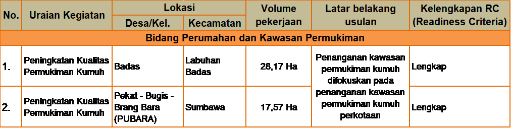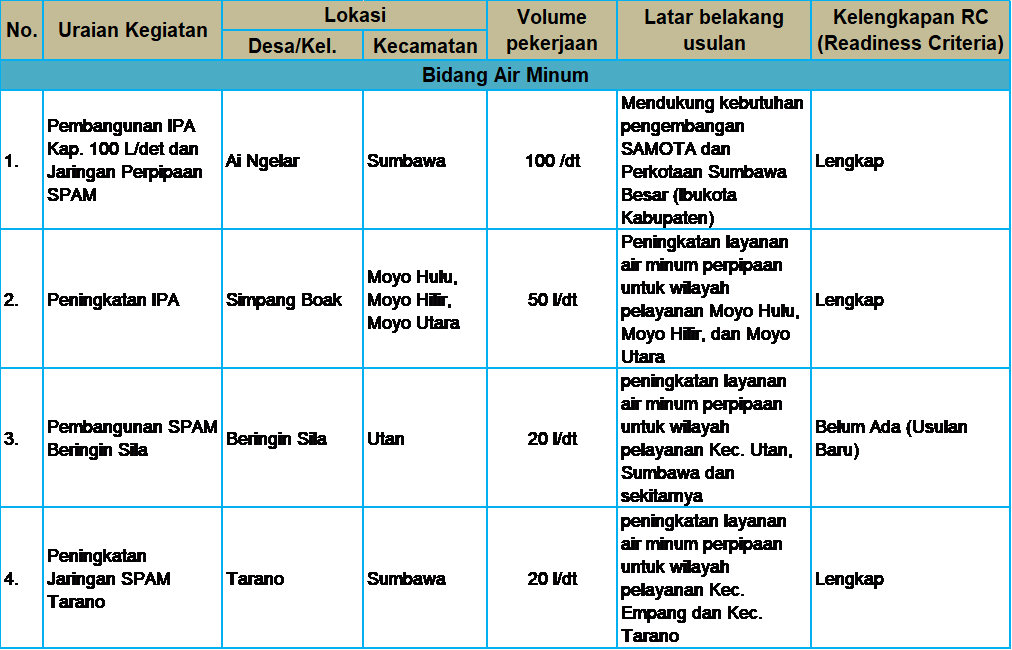 Terakhir, L.M. Irvan Tjahyadi, selaku perwakilan tim teknis SPKP BPPW Provinsi NTB memaparkan bahwa hingga saat ini Aplikasi SIPKP (sispkp.ciptakarya.pu.go.id) sedang menjalani maintenance atau perbaikan, sehingga untuk melakukan penyampaian usulan dilakukan melalui surat kepada Direktur Jendral Cipta Karya Kementerian PUPR yang merupakan salah satu ouput dari Rapat Koordinasi kali ini selain adanya Berita Acara yang akan ditandatangani oleh perwakilan OPD untuk memperkuat statement penyampaian usulan Pemerintah Daerah. Pemerintah Kabupaten Sumbawa melalui Tim Kerja Perumahan dan Kawasan Permukiman (POKJA PKP) bersama Balai Prasarana Permukiman Wilayah (BPPW) NTB telah menyusun Berita Acara dan Surat Penyampaian Usulan Kegiatan Sektor Cipta Karya untuk TA. 2024, adapun usulan tersebut antara lain.