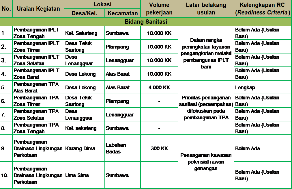 Dalam hal pembangunan Instalasi Pengolahan Lumpur Tinja (IPLT), IPLT Raberas didesain hanya untuk melayani Zona Tengah Kabupaten Sumbawa (Kecamatan Sumbawa, Moyo Hilir, Moyo Utara, Labuhan Badas, Unteriwes, Batulanteh, Lopok dan Lape) sehingga diperlukan pembangunan IPLT untuk menjangkau zona barat, selatan dan timur Kabupaten Sumbawa. Kepala Bidang Persampahan dan Limbah Bahan Berbahaya Beracun, Dinas Lingkungan Hidup kabupaten Sumbawa mengusulkan agar IPLT dibangun di lokasi yang sama dengan TPA seperti yang terjadi pada pembangunan IPLT Raberas yang berada di komplek TPA Raberas sehingga koordinasi dan kolaborasi antar OPD baik pada pra maupun pasca pembangunan lebih intens terjalin, hal ini juga mempermudah dalam melakukan pembebasan lahan karena berada pada satu lokasi yang pada akhirnya akan meringankan biaya operasi dan pemeliharaan (O & P). Usulan tersebut kemudian dituangkan dalam Berita Acara dan Surat Penyampaian Usulan Kegiatan ke Kementerian PUPR dengan melihat data-data pendukung yang menjadi Readiness Criteria (RC).